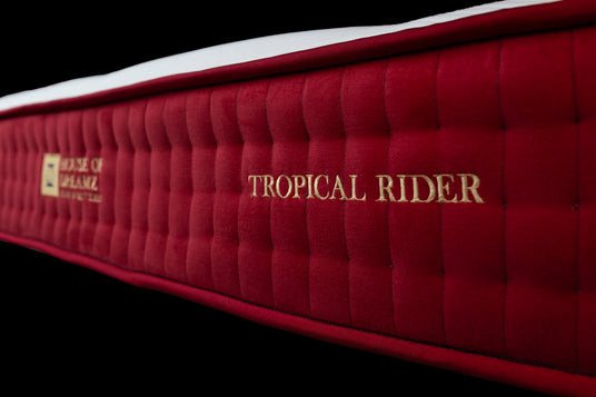 Tropical Rider transporterer dig til fredfyldte kyster med et bølgeinspireret mønster parret med rige bordeauxrøde kanter. Hovedmaterialet er bæredygtige COCONUT FIBERS, der giver opdrift, kombineret med andre naturlige materialer, herunder LATEX ogNLD GOTS WOOL/ORGANIC COTTON, der sikrer en kølig og åndbar, men også luksuriøs, sund og langvarig søvnoplevelse, der føles som en flugt til paradis.